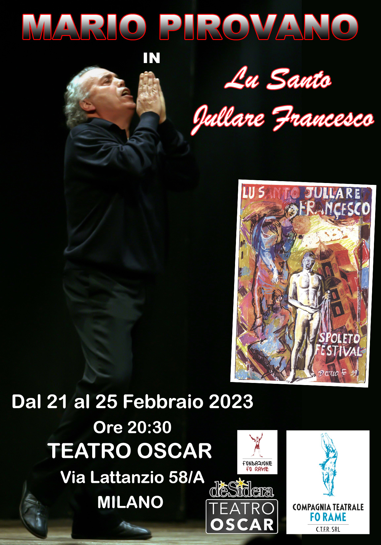 “Lu Santo Jullàre Françesco” è un monologo in cui prende vita un’intera serie di personaggi dell’Italia medievale: Papi e Cardinali, soldati sui campi di battaglia, contadini e venditori al mercato, monaci e cavapietre. La realtà storica e la tradizione popolare si intrecciano nel ripercorrere alcuni dei momenti più significativi della vita di Francesco: la richiesta di approvazione della Regola al Papa Innocenzo III, la predica agli uccelli, l’incontro con il lupo, la malattia agli occhi…Lavorando su leggende popolari, su testi canonici del Trecento e su documenti emersi negli ultimi cinquant’anni, Dario Fo elabora un’immagine non agiografica di san Francesco: spogliato dal mito, ritroviamo un personaggio provocatorio, coerente, coraggioso, ironico. Del resto, era lo stesso Francesco a definirsi “jullare di Dio”, e questo proprio negli anni in cui l’imperatore Federico II promulgava un editto contro i “Joculatores” considerandoli buffoni osceni!