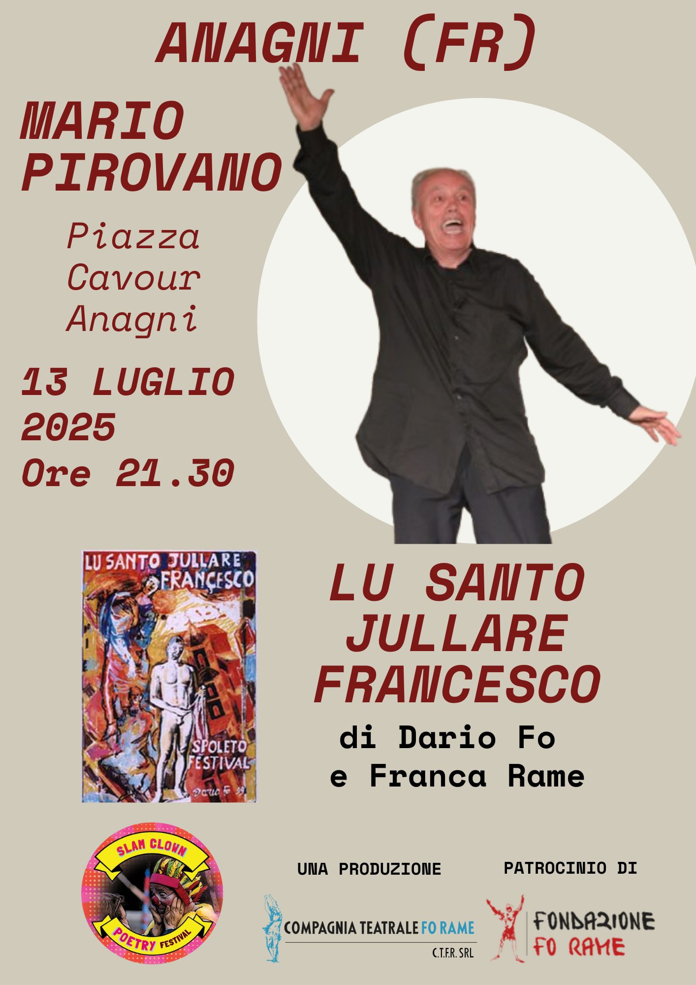 “Lu Santo Jullàre Françesco” è un monologo in cui prende vita un’ intera serie di personaggi dell’Italia medievale: Papi e Cardinali, soldati sui campi di battaglia, contadini e venditori al mercato, monaci e cavapietre.