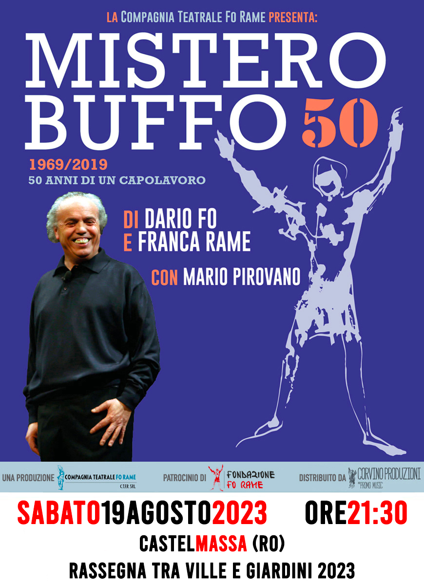 Sabato 19 agosto, ore 21:30, a Castelmassa, provincia di Rovigo, avrò il piacere di portare in scena il Mistero Buffo di Dario Fo e Franca Rame all’interno della rassegna “Tra Ville e Giardini 2023”.
