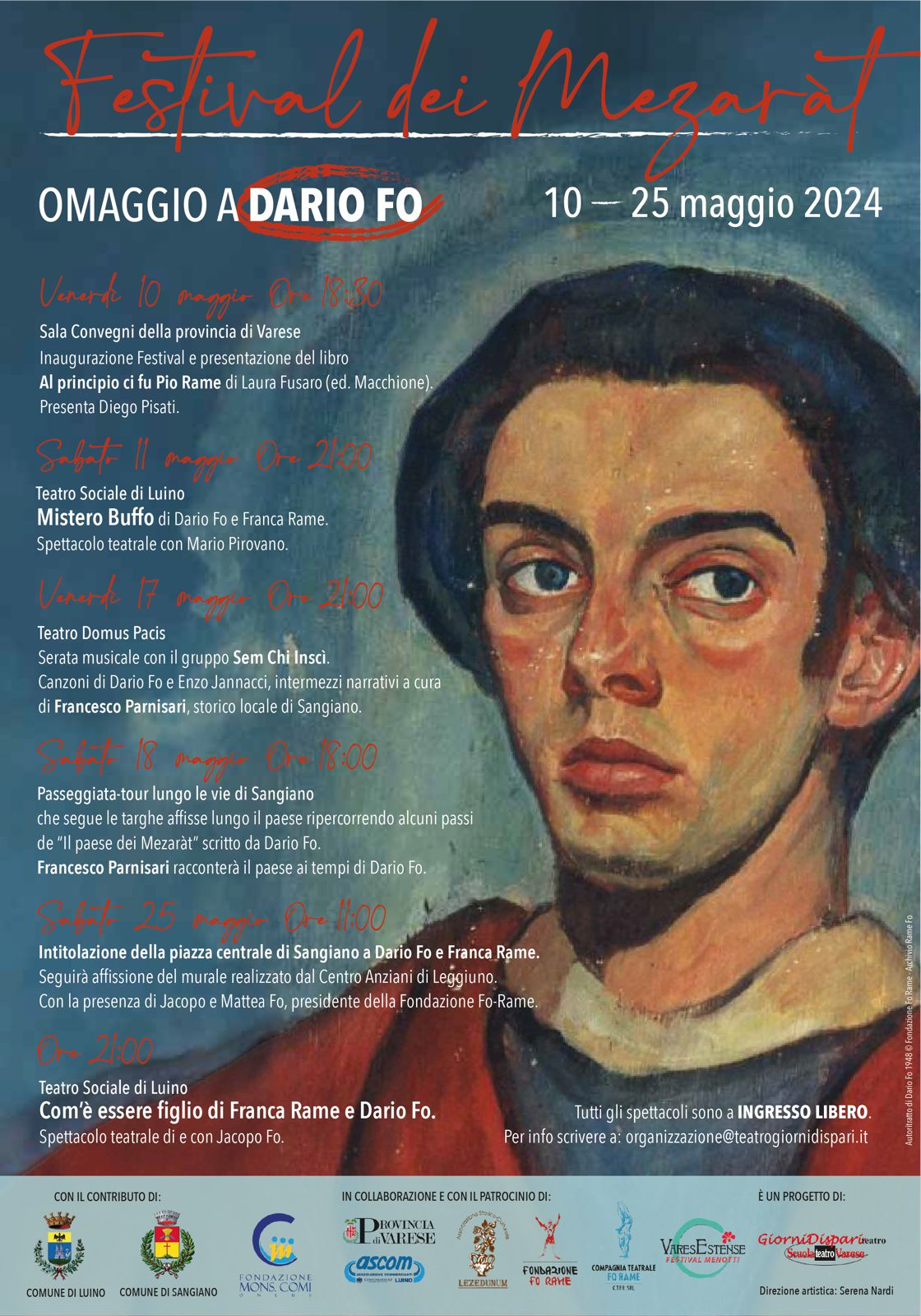 All’interno della prima edizione dei Festival dei Mezarat, dedicato a Dario Fo e Franca Rame, porterò in scena “Mistero Buffo” al Teatro Sociale di Luino, provincia di Varese.