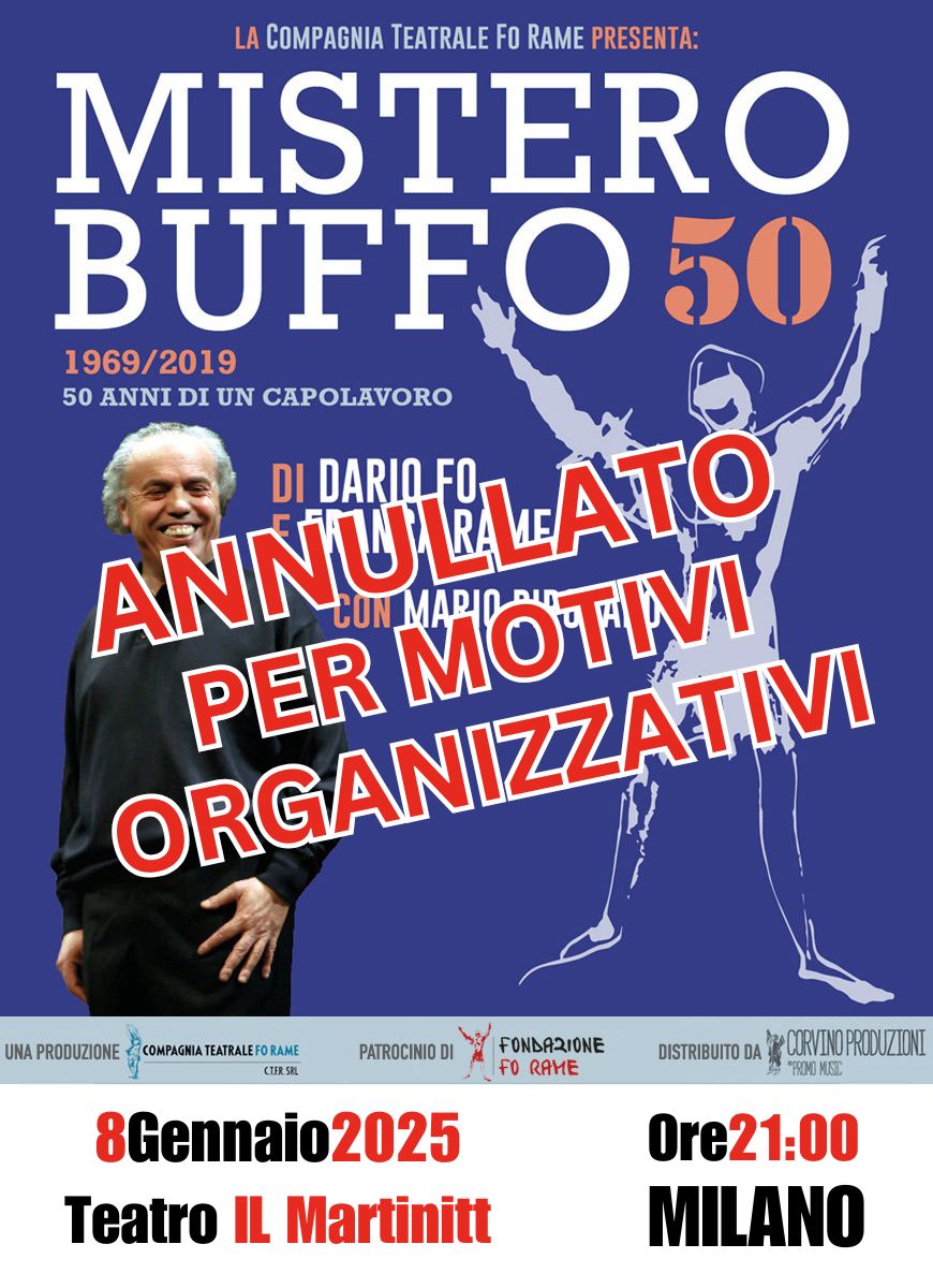 Nell’Aula Magna dell’Università Statale di Milano, occupata da oltre 2000 studenti, entrò il 30 maggio 1969 Dario Fo per presentare in anteprima assoluta il suo “Mistero Buffo”. Fu l’inizio di un percorso che attrasse subito centinaia di migliaia di persone, la maggior parte delle quali non frequentavano il teatro nei circuiti classici e convenzionali. Riproposto dal 1969 ad oggi in oltre 5000 allestimenti, in Italia e all’estero, nelle piazze, nelle scuole, nelle fabbriche, nei teatri, e anche nelle chiese! Arricchito di volta in volta da nuove e diverse giullarate, “Mistero Buffo” è uno straordinario impasto comico-drammatico le cui radici affondano nel teatro popolare, quello delle sacre rappresentazioni medievali (chiamate misteri), dei giullari e della commedia dell’arte. Per anni Dario Fo, insieme a Franca Rame, ha raccolto documenti di teatro popolare di varie regioni italiane e li ha ricostruiti in questo spettacolo dal sapore ironico e profetico che diverte, stimola, affascina, ed ha la capacità di coinvolgere anche le più giovani generazioni. Le giullarate, infatti, affrontano tematiche sempre attuali: il potere, l’ingiustizia, la fame, la ribellione, la ricerca di una vita degna da condividere gioiosamente. La lingua in cui vengono recitate è un particolare insieme di dialetti delle regioni settentrionali e centrali dell’Italia, una lingua sempre perfettamente comprensibile grazie alla forza della gestualità che accompagna la narrazione. Si tratta di un monologo senza scenario, senza musica, senza costumi, che sollecita l’immaginazione e la partecipazione degli spettatori al punto da rendere quasi visibile, sulla scena, una molteplicità di personaggi, di oggetti e di luoghi. Il carattere di questa recitazione ci riporta di colpo alle origini della tradizione orale, della narrazione pura che trova la sua forza nella ricchezza del racconto e nella mimica dell’attore. E’ questo carattere che ha influenzato le generazioni teatrali successive a Fo, e in particolare il suo diretto allievo Mario Pirovano, che oggi si impegna a portare nei teatri di tutto il mondo i testi di Dario Fo e Franca Rame. Numerosi sono i monologhi che Dario Fo e Franca Rame hanno portato in scena nelle varie edizioni di Mistero Buffo, e oggi, per festeggiare i primi 50 anni di questo meraviglioso spettacolo che ha segnato la storia del teatro, vogliamo proporne alcuni fra quelli che vennero portati in scena durante le primissime rappresentazioni.