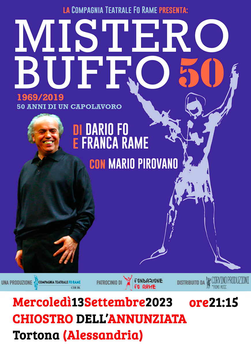 Il Mistero Buffo di Dario Fo e Franca Rame, interpretato da Mario Pirovano, sbarca a Tortona, Alessandria, mercoledì 13 Settembre 2023, alle ore 21:15, nella meravigliosa cornice del Chiostro dell’Annunziata.