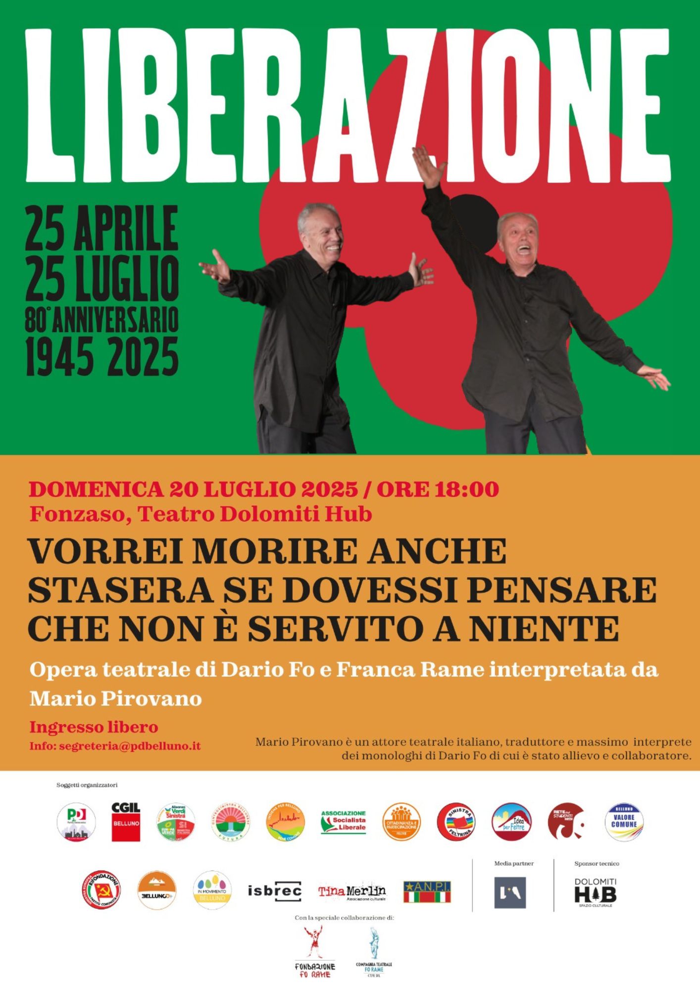 Dopo qualche anno MARIO PIROVANO riporta in scena “Vorrei morire anche stasera se dovessi pensare che non è servito a niente“, opera teatrale di Dario Fo e Franca Rame sulla Resistenza antifascista, riportando le testimonianze dirette dei partigiani protagonisti della lotta. Tre storie diverse, raccontate in prima persona da Mario Pirovano nei vari dialetti delle valli del Nord Italia.