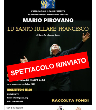 ATTENZIONE: lo spettacolo Lu Santo Jullare Francesco in programma domani 24 Giugno a Suisio, Bergamo, è stato rinviato a data da destinarsi per motivi tecnici. I biglietti venduti verranno rimborsati. Spero di poter tornare presto,…