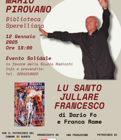 Domenica 12 Gennaio 2025 Gubbio, Biblioteca Sperelliana, ore 18.00 MARIO PIROVANO in Lu Santo Jullare Francesco di Dario Fo e Franca Rame Evento Solidale in favore della Scuola Radicchi Info e prevendite: tel. 3291019022 “Lu…