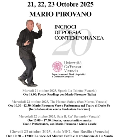 Martedì 21 ottobre 2025, Spazio La Toletta (Venezia) Ore 18.00: Poetry Readings con Mario Pirovano (Italia) Mercoledì 22 ottobre 2025, The Human Safety (San Marco, Venezia) Ore 10.30 –12.30: Mario Pirovano: Voce e Performance nel…